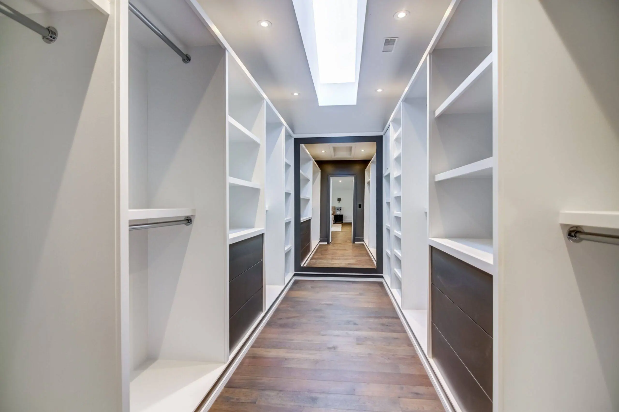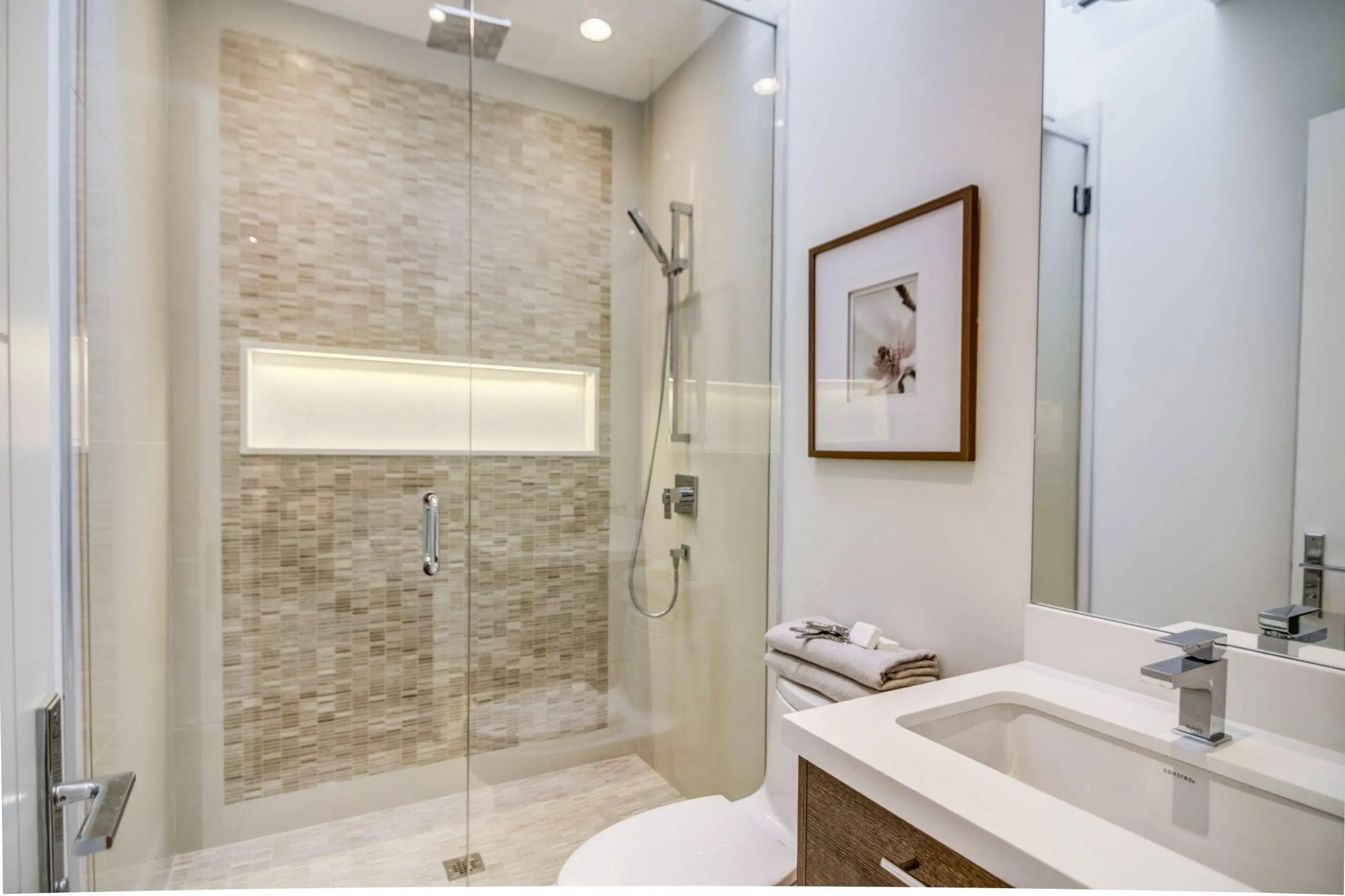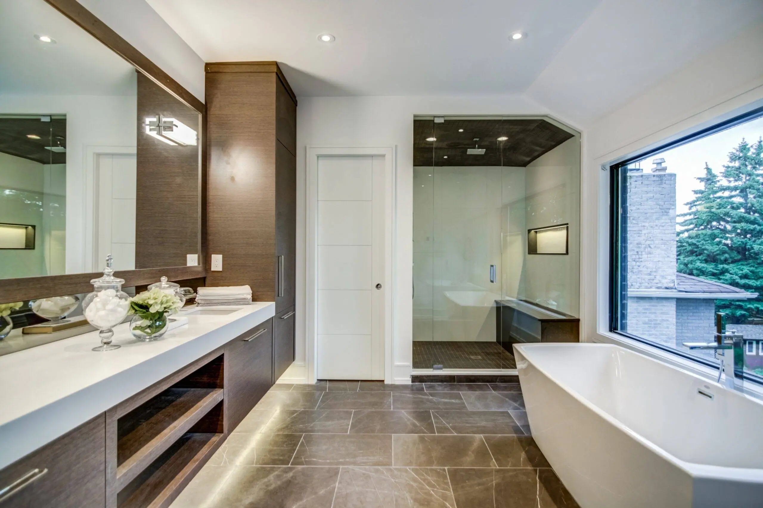 The flooring was paired with custom wooden cabinetry, which introduced a natural, warm element to the bathroom while offering ample storage and enhancing the room’s aesthetic appeal.