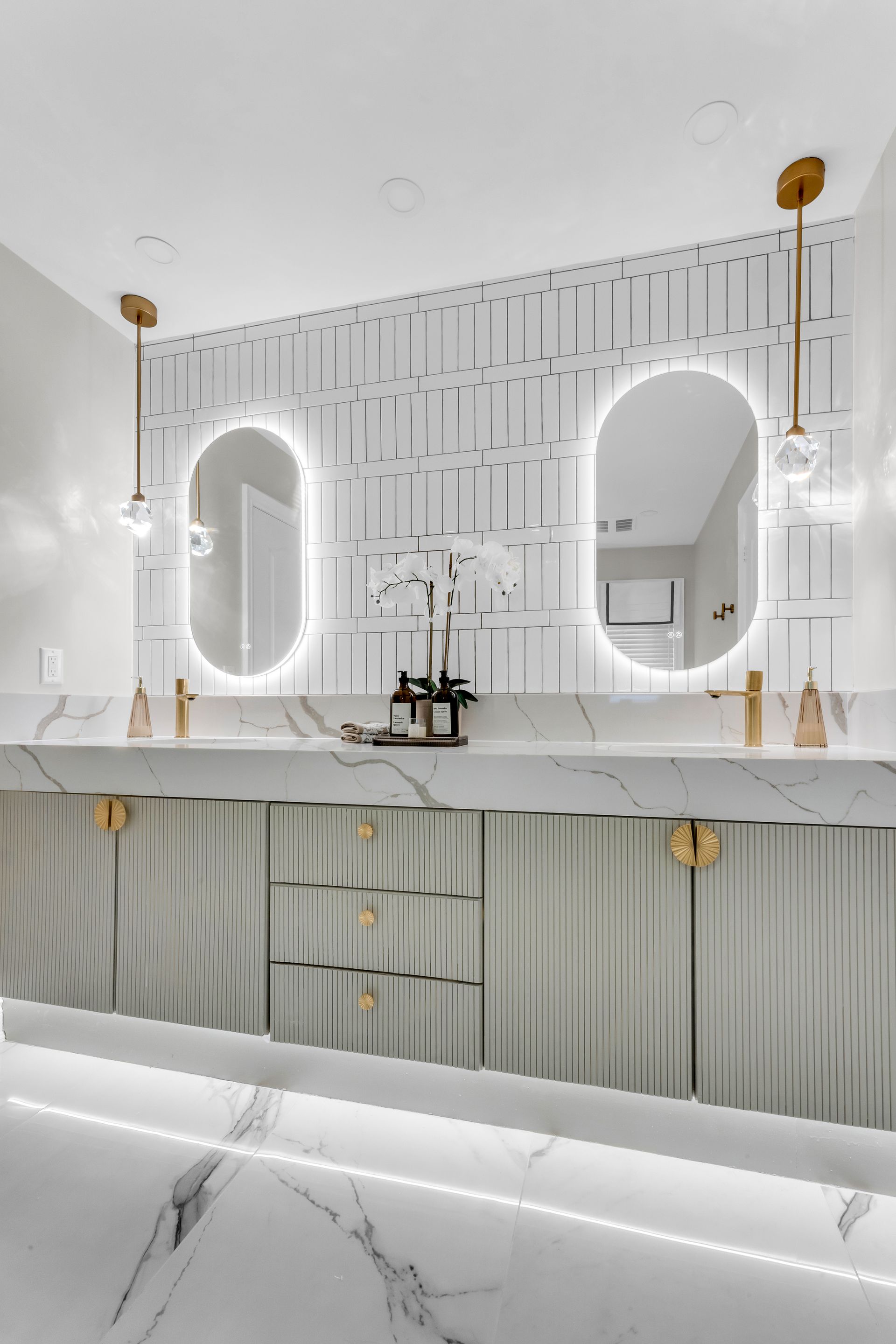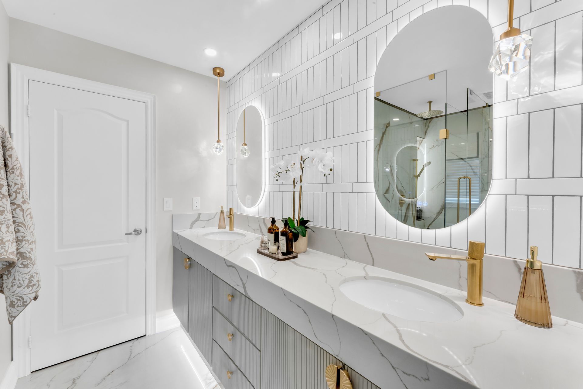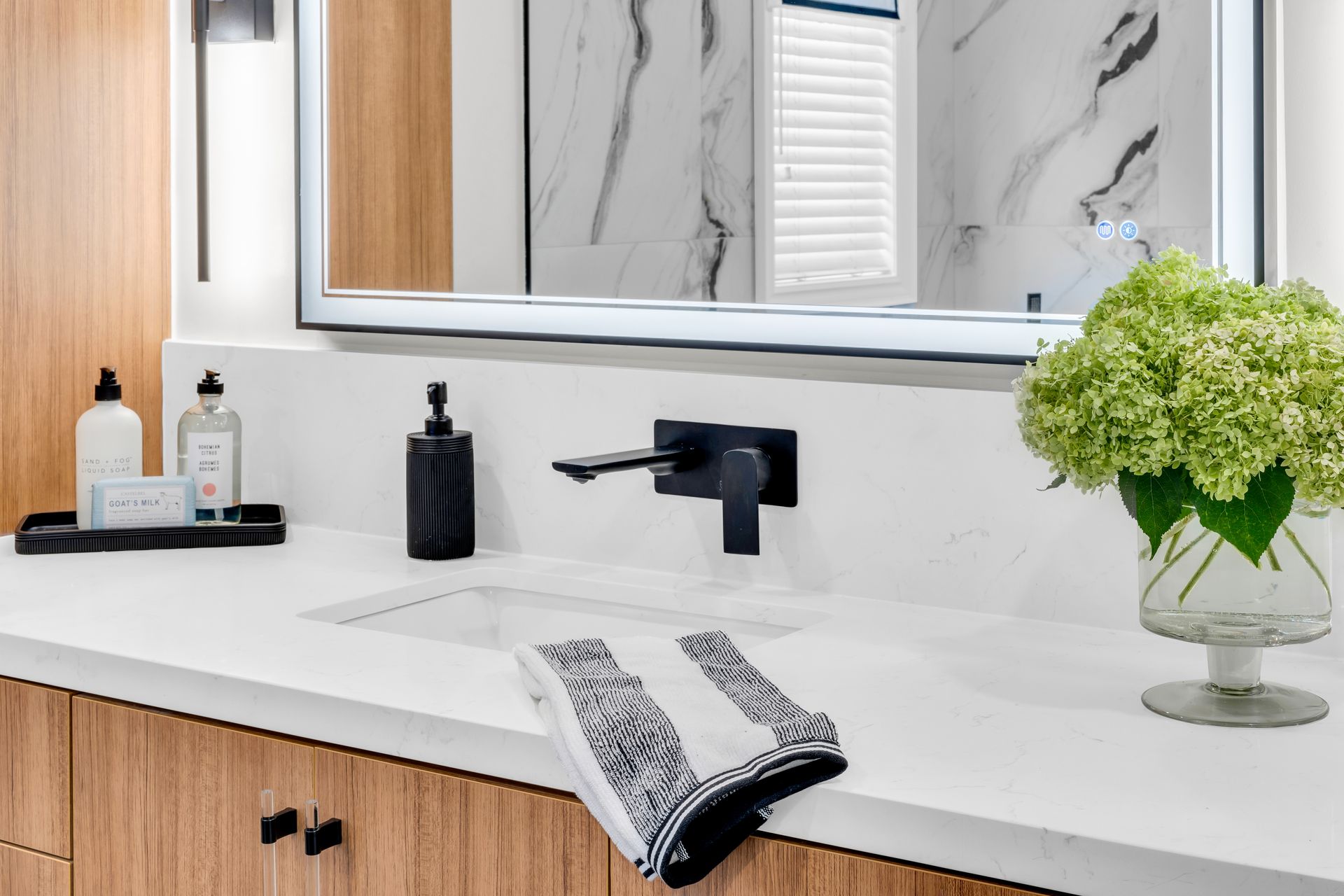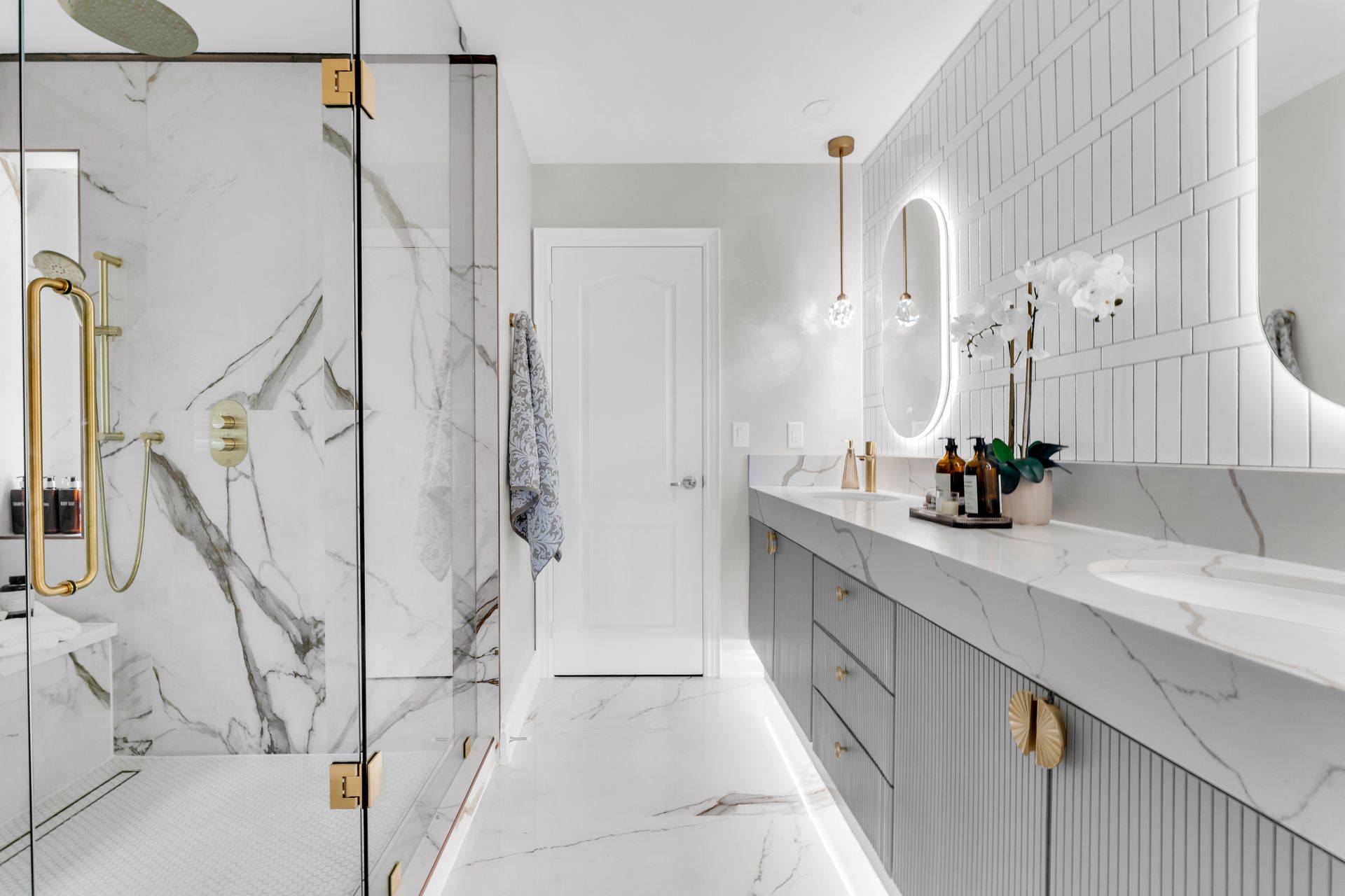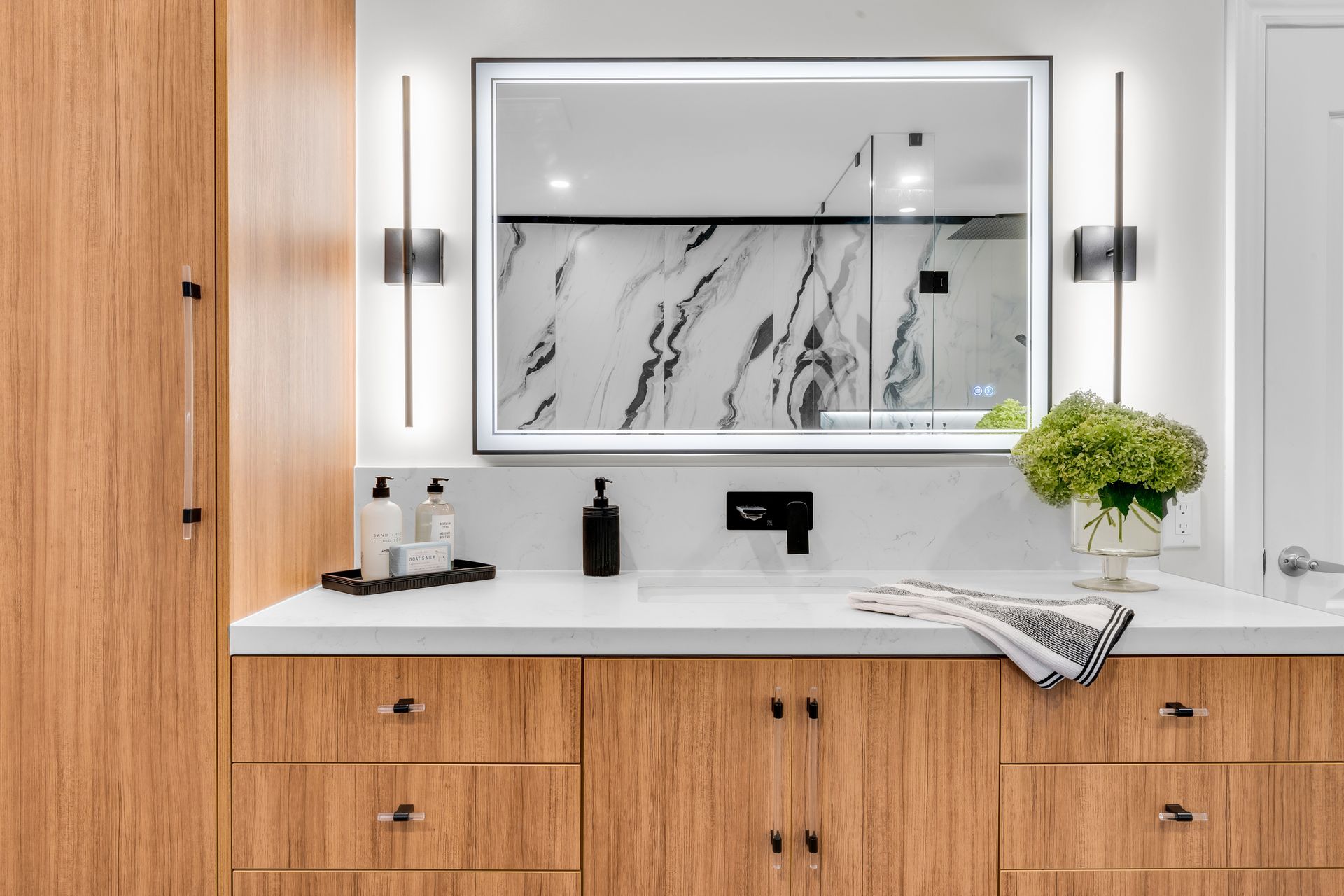The Seabright project's bathroom and tile remodel focused on creating a luxurious yet practical space. Vinyl flooring was chosen for its durability and sleek appearance, adding a modern touch that complemented the overall design. The flooring was paired with custom wooden cabinetry, which introduced a natural, warm element to the bathroom while offering ample storage and enhancing the room's aesthetic appeal.