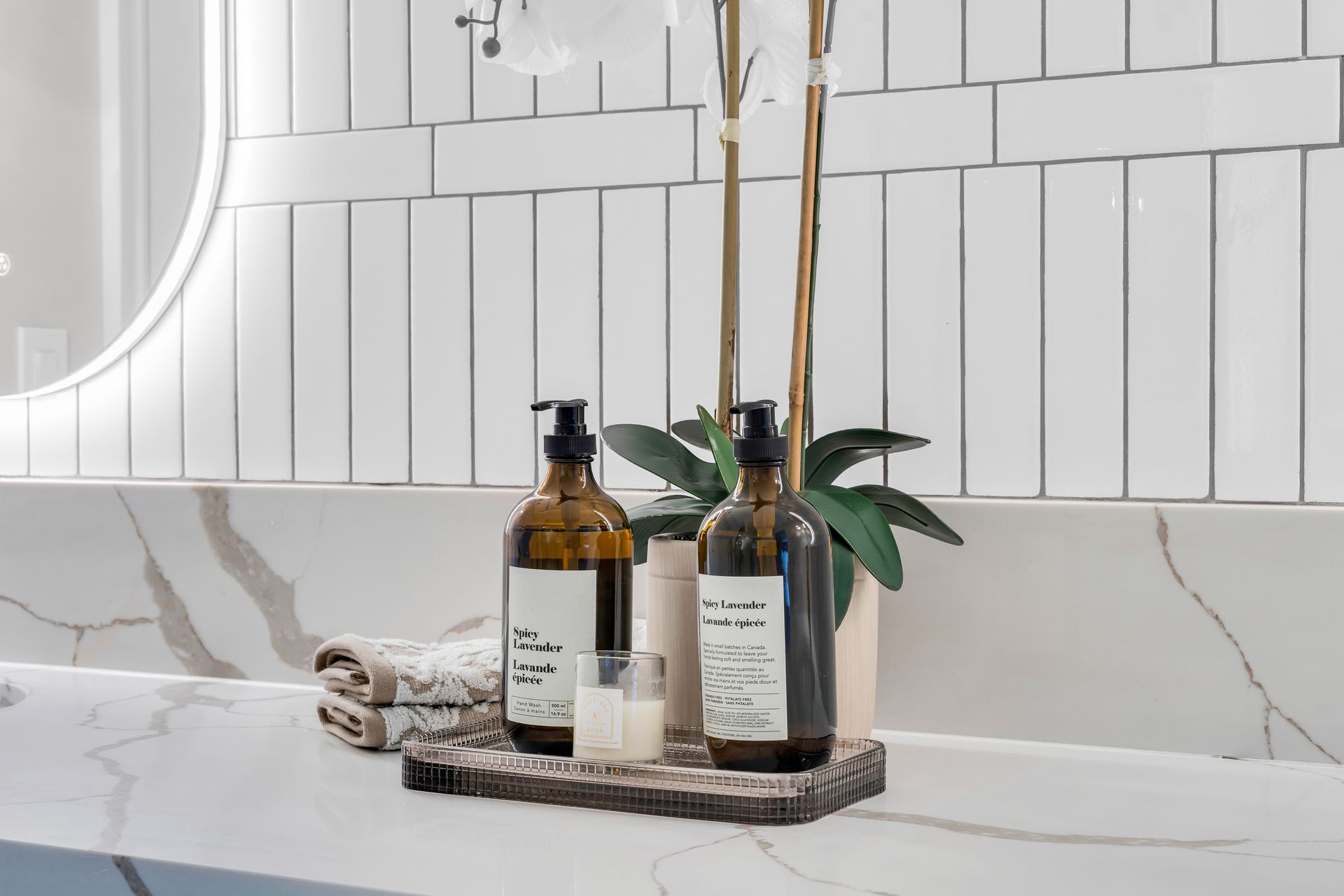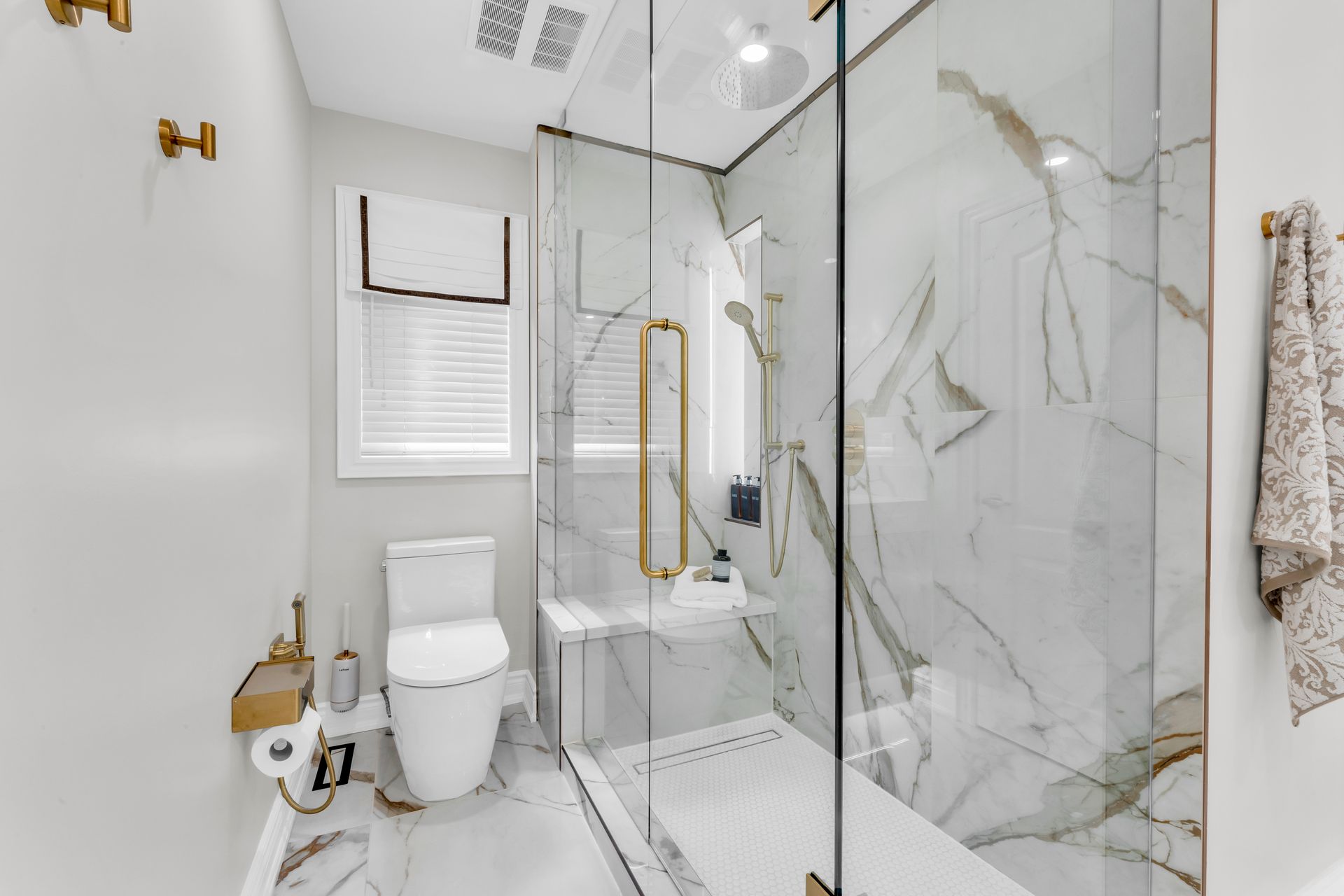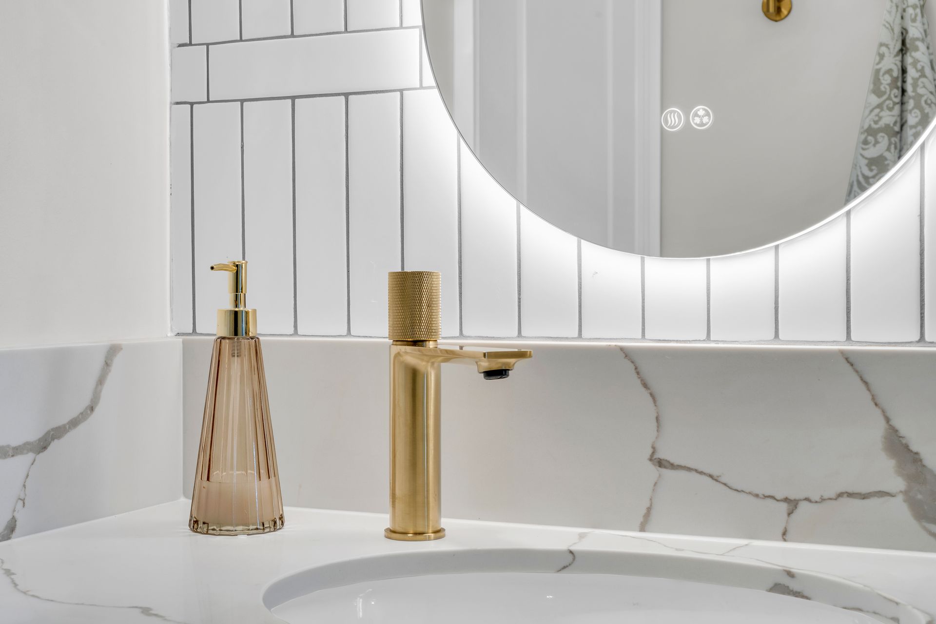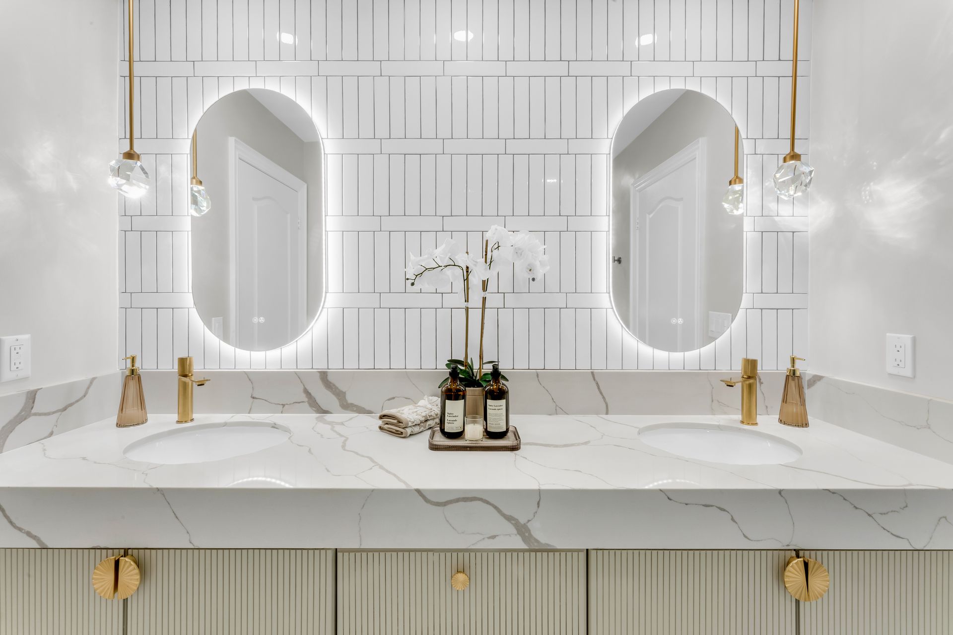 The Seabright project's bathroom and tile remodel focused on creating a luxurious yet practical space. Vinyl flooring was chosen for its durability and sleek appearance, adding a modern touch that complemented the overall design. The flooring was paired with custom wooden cabinetry, which introduced a natural, warm element to the bathroom while offering ample storage and enhancing the room's aesthetic appeal.