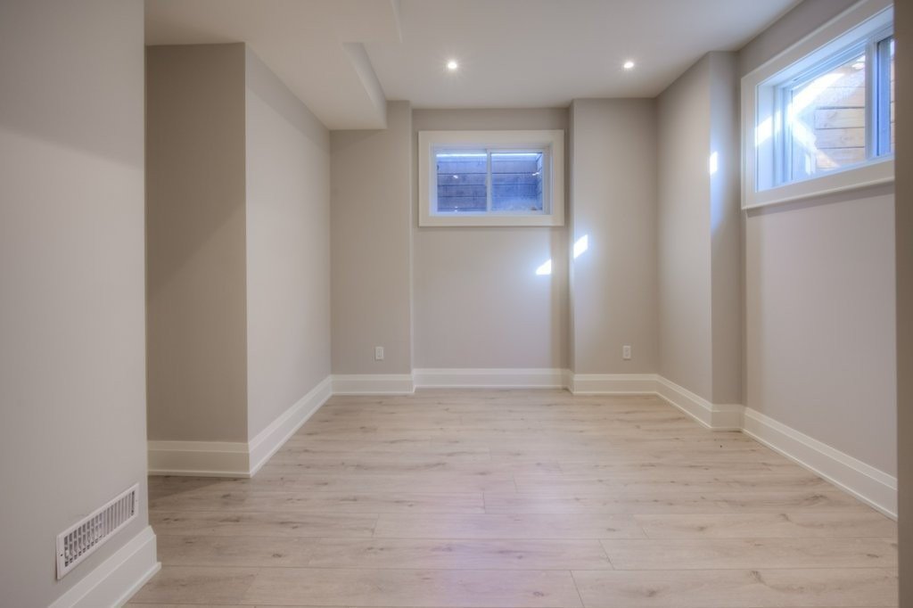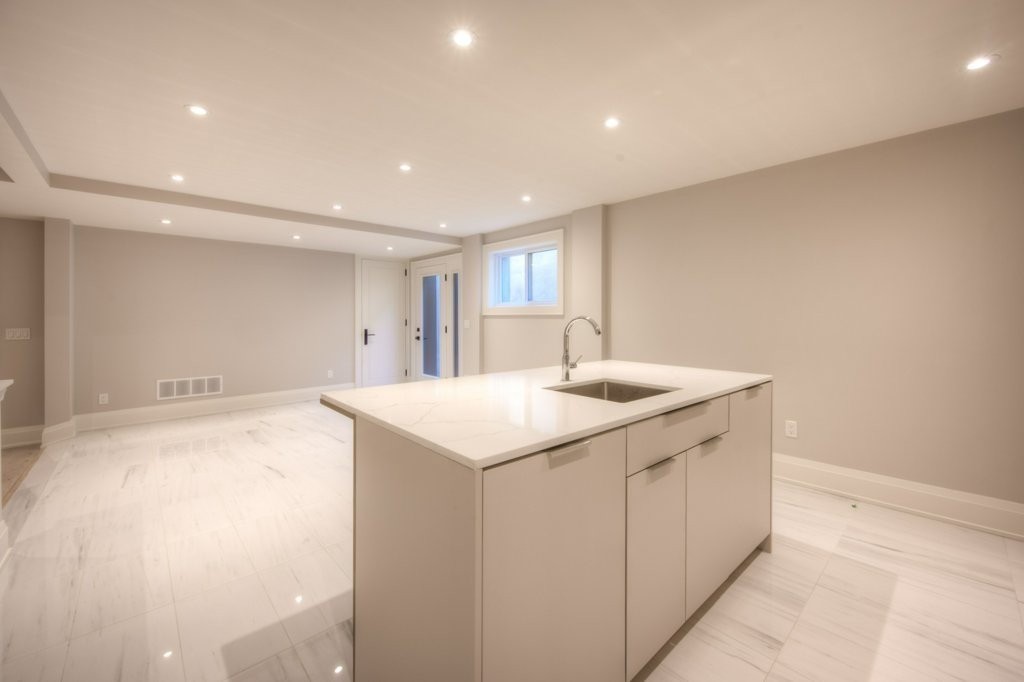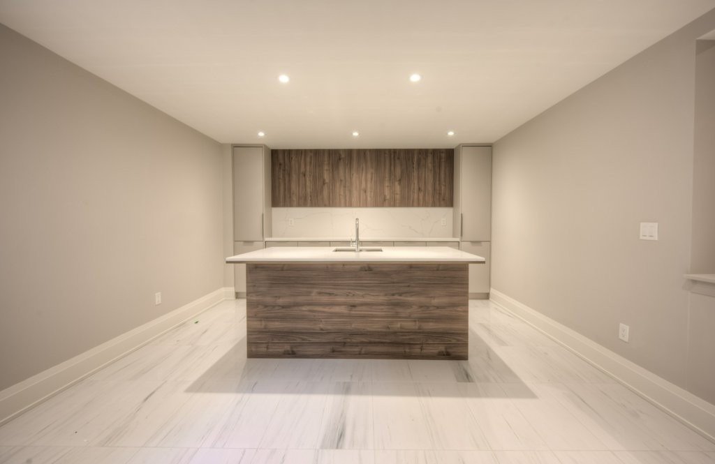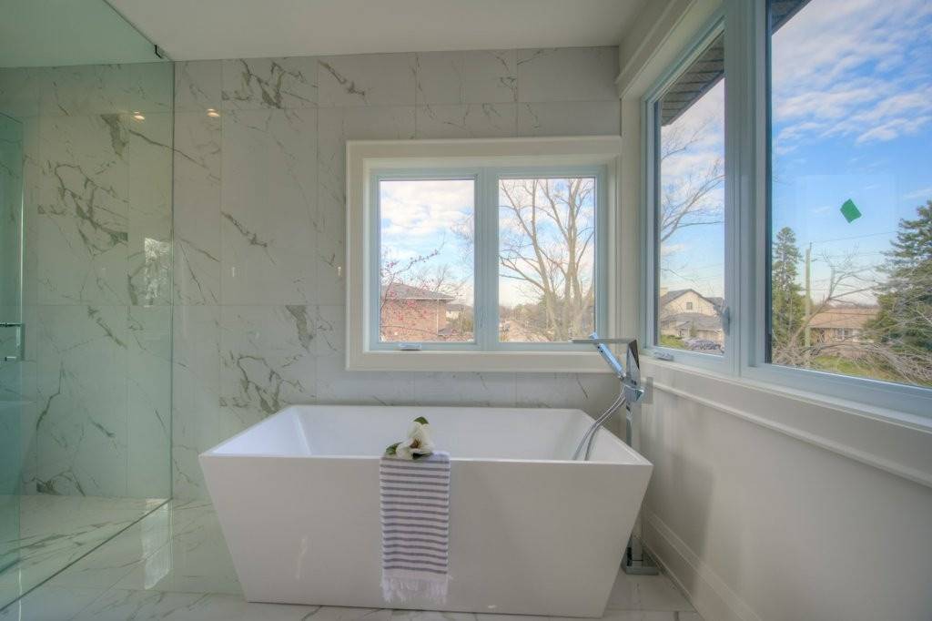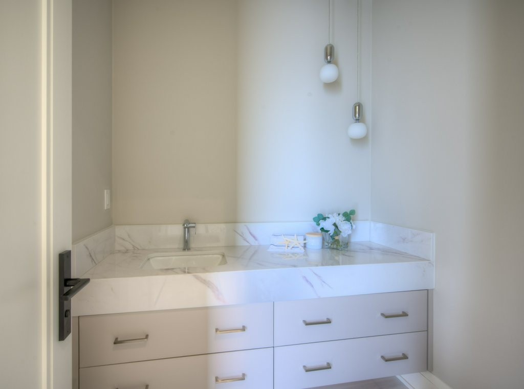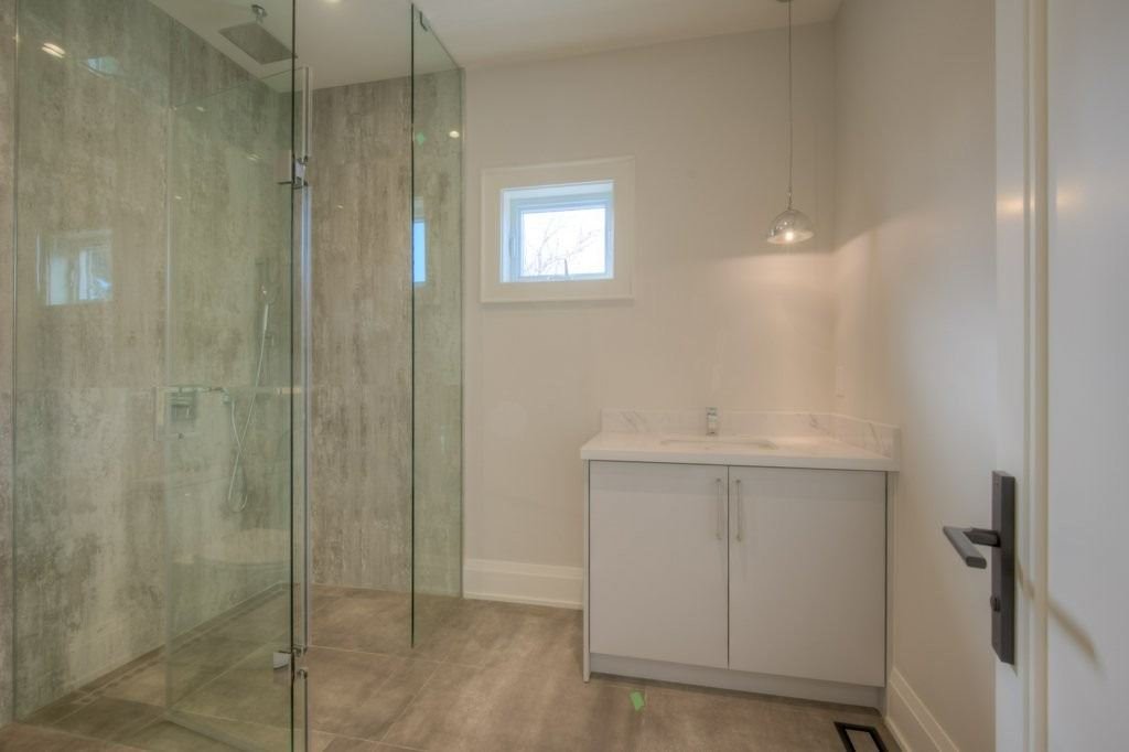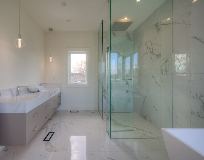 The flooring was paired with custom wooden cabinetry, which introduced a natural, warm element to the bathroom while offering ample storage and enhancing the room’s aesthetic appeal.