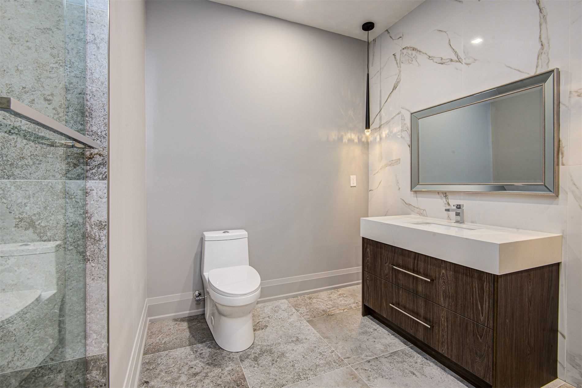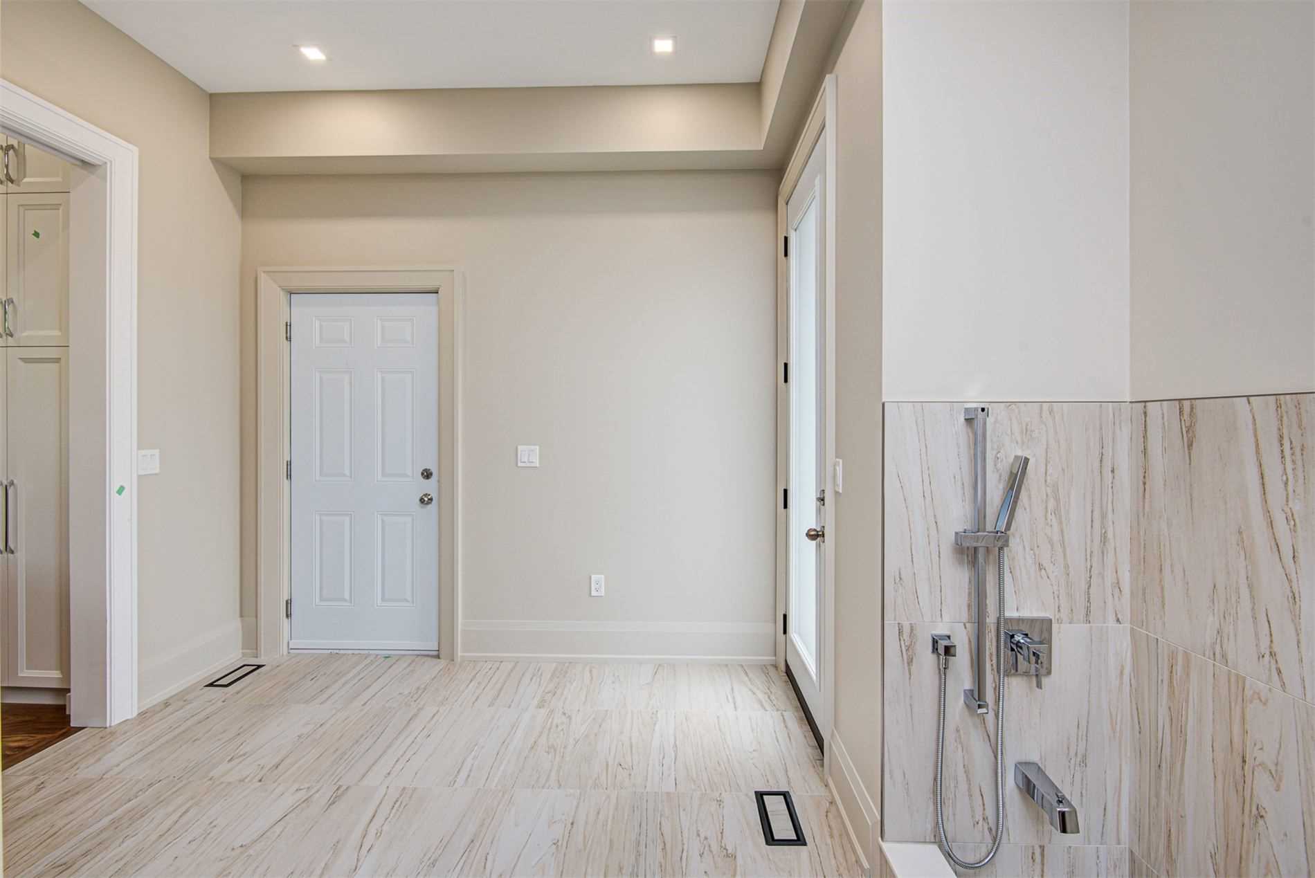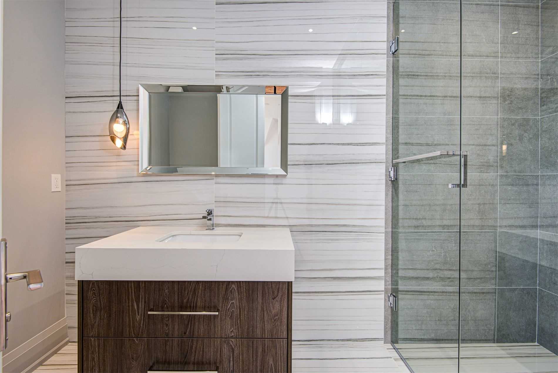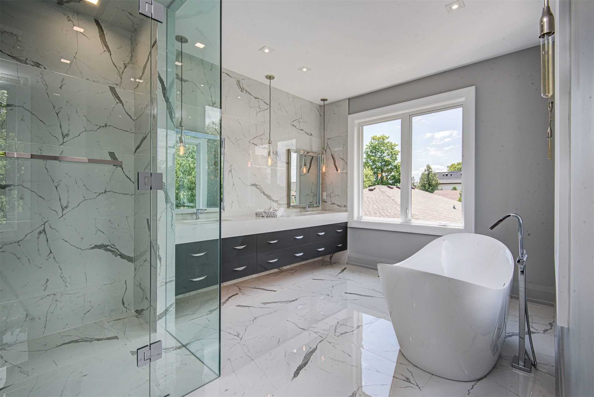 The flooring was paired with custom wooden cabinetry, which introduced a natural, warm element to the bathroom while offering ample storage and enhancing the room’s aesthetic appeal.